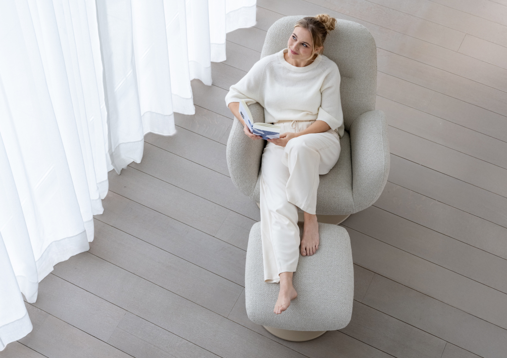 Deze fauteuil is ontworpen om maximale bewegingsvrijheid te bieden: je kunt hem in elke richting draaien en er zelfs een beetje in wiegen voor extra comfort.
